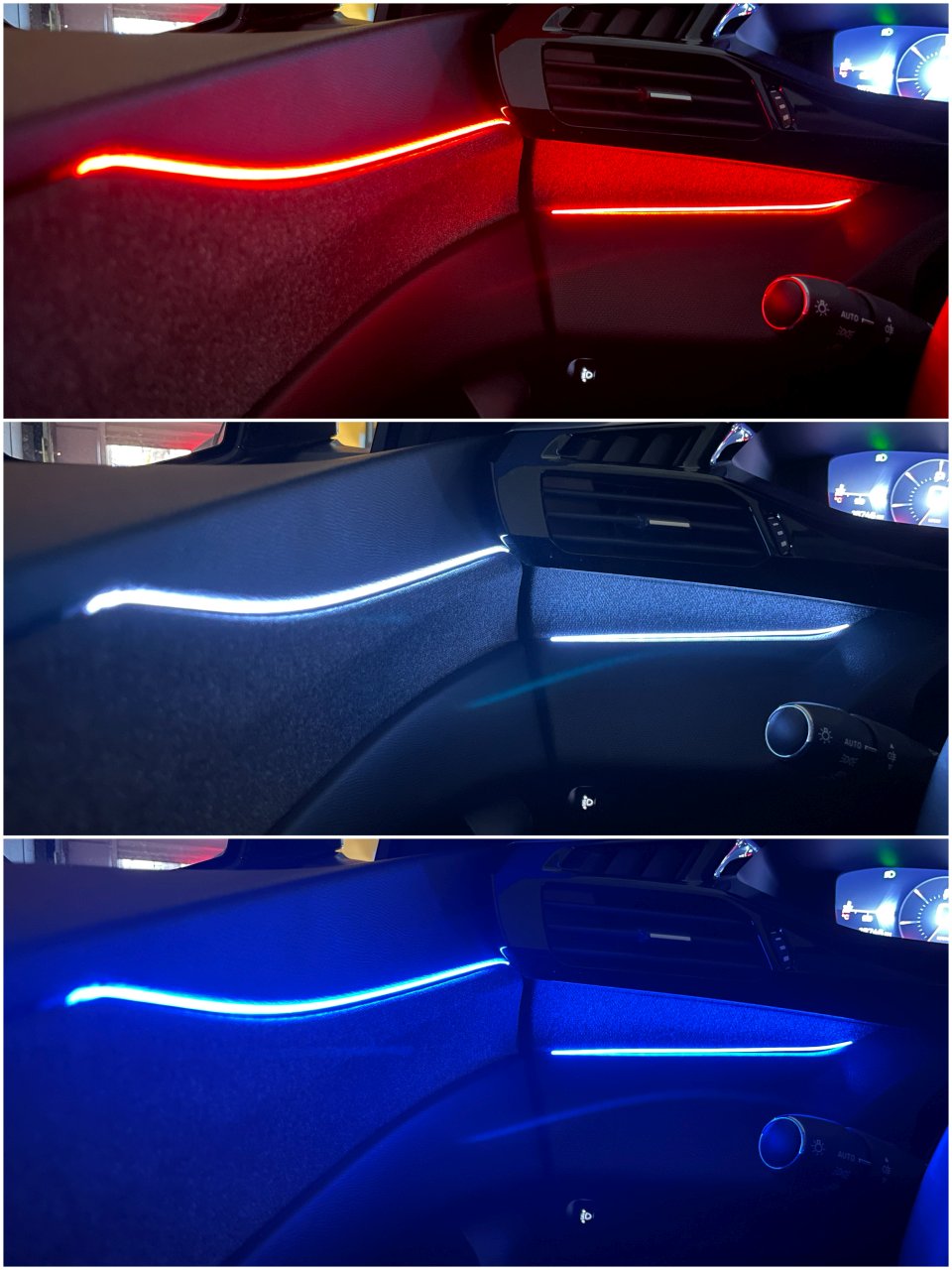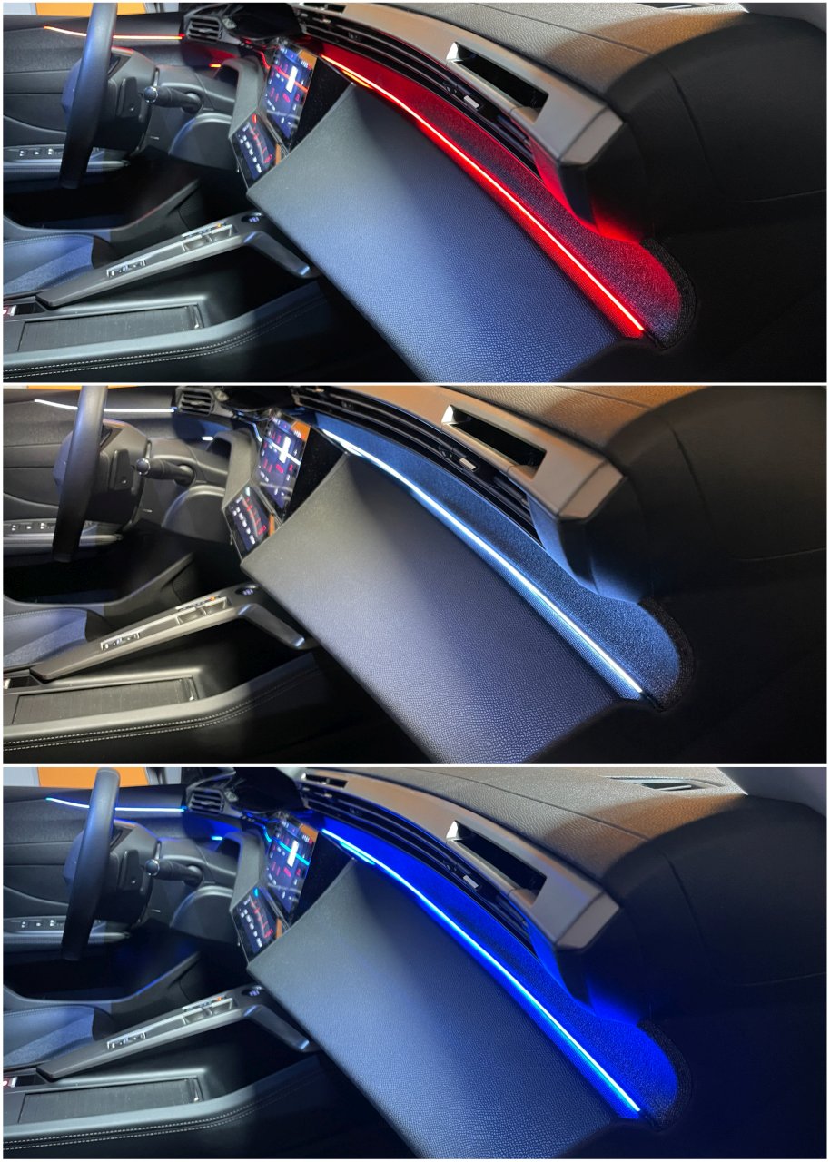 We present to you our latest development in ambient lighting – our ambitrim® Digital RGB RGBIC LED. This new ambient lighting illuminates your interior with absolute silence, without any loss of brightness, and offers numerous modes to set the perfect ambiance! Whether on the dashboard, in the doors, or other locations, the possibilities are endless, allowing you to customize your vehicle to your liking. Light bars for doors, dashboard, lighting units for footwells, side compartments, and door handles, all are achievable with the ambitrim® Digital RGB RGBIC LED ambient lighting. No wish goes unfulfilled.