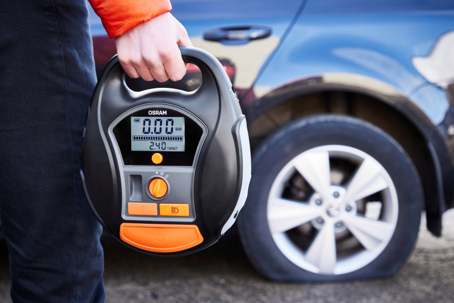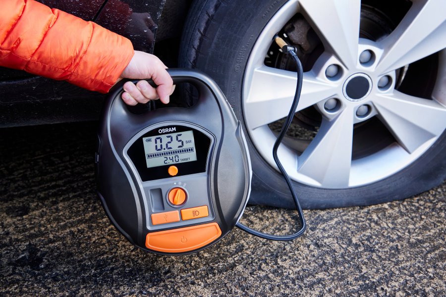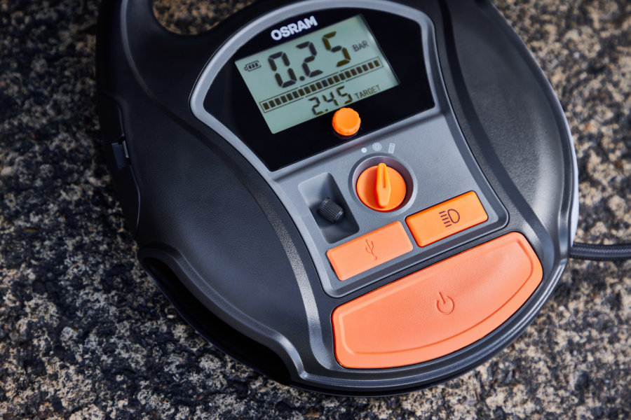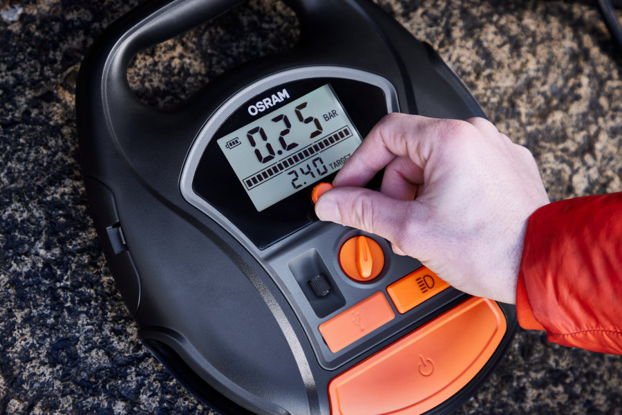 The OSRAM TYREinflate 6000 is a cordless and rechargeable tyre inflator with Li-Ion battery, making it an ideal companion for camping and road trips. The OTIR 6000 digital tyre inflator can inflate a tyre in just two minutes1)2) and has a special setting for other inflatable items such as air beds, air mattresses, balls and more. The auto stop function and the deflator valve help to keep the tyres and other inflatables optimally inflated. . The backlit LED display and integrated LED light provide improved readability of the pressure settings and improved illumination of the working area even in reduced visibility conditions or at night. Thanks to the powerbank function, the OSRAM TYREinflate 6000 can also be used as a charger for electronic devices such as your mobile phone. The scope of delivery includes a mains charger and a 12-volt cable for direct power supply, if required. Also included is a 10-piece adapter set, a storage bag and spare valve caps. OSRAM offers a 2-year guarantee1) on this product.